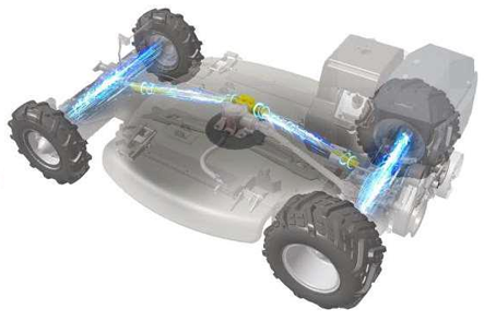 Hydrostatická převodovka s uzavřeným okruhem s chladičem oleje pohání mechanickou převodovku pojezdu se dvěma rozsahy, nízkým do rychlosti 7,7 km/h a vysokým do 13,8 km/h.