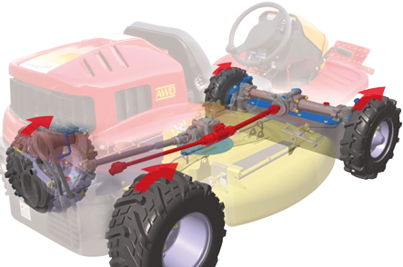Model CMX 2402 je poháněn 2-válcovým motorem Honda o výkonu 24 k a je vybaven zdvojeným ručním a nožním ovládáním pojezdu pro maximální kontrolu a bezpečnost. Přední náprava i žací ústrojí jsou poháněny kloubovým hřídelem, přední a zadní litinová náprava je zárukou kvality a robustnosti. Zesílená hydrostatická převodovka je doplněna chladičem oleje pro maximální vytrvalost a sílu