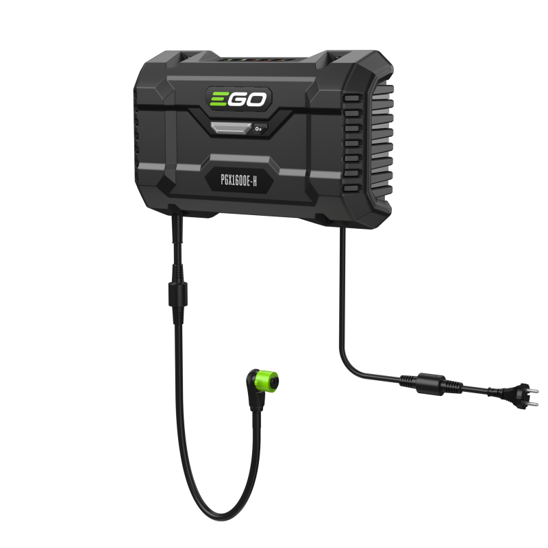 Nabíječka je opatřena nabíjecím kabelem s příslušným konektorem pro připojení nabíjecího adaptéru PGX300D, který je opatřen také nabíjecím kabelem pro připojení druhého, třetího, čtvrtého...adaptéru. Nabíječka je opatřena řídící elektronikou, která naprosto samostatně vyhodnotí stav baterií a automaticky zvolí režim nabíjení, dobu nabíjení a nabíjecí proud. Stav baterie a aktuální stav nabití je indikován LED diodami na panelu. Nabíječka je tak plně automatická bez jakéhokoliv nutného zásahu ze strany uživatele. Takže firma, využívající celou flotilu více strojů EGO, tak např. přes noc nabije současně celý počet baterií, které pokryjí výkon potřebný pro celodenní práci všech strojů. Přes Bluetooth rozhraní je možnost připojení na dálku pomocí EGO Connect aplikace, což umožňuje uživateli nejenom sledovat výkon stroje ale také hlídat aktuální stav baterie tak, aby byla včas připravena k práci.