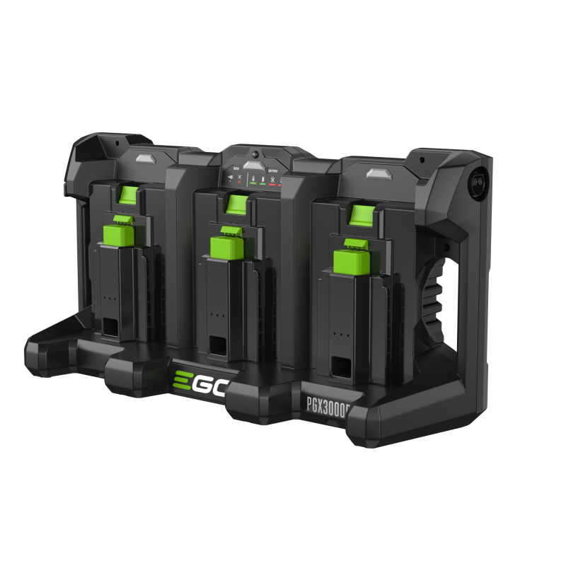 Nabíjecí adaptér PGX300D je k nabíječce připojen nabíjecím kabelem a konektorem se zámkem. 3-místných nabíjecích adaptérů PGX3000D může být připojeno do série za sebou několik a lze tak nabíjet i několik desítek baterií najednou. Nabíječka je opatřena řídící elektronikou, která naprosto samostatně vyhodnotí stav baterií a automaticky zvolí režim nabíjení, dobu nabíjení a nabíjecí proud. Stav baterie a aktuální stav nabití je indikován LED diodami na každé z nich. Takže firma, využívající celou flotilu více strojů EGO, tak např. přes noc nabije současně celý počet baterií, které pokryjí výkon potřebný pro celodenní práci všech strojů.
