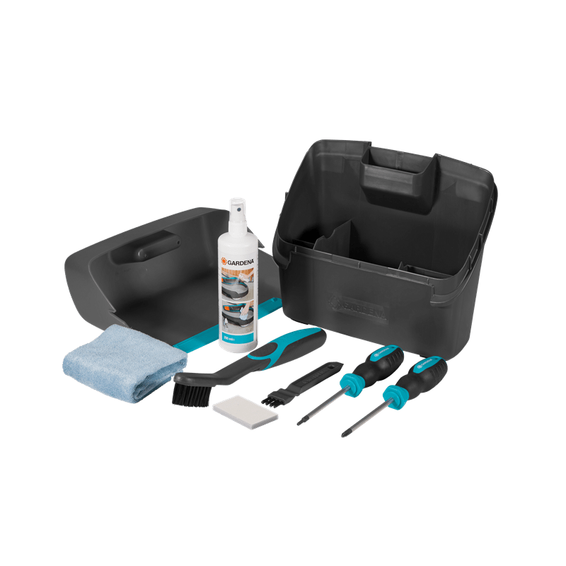 GARDENA sada pro údržbu a čištění robotické sekačky obsahuje brusnou podložku pro očištění kontaktů od nečistot, dva různé kartáče k odstraňování suché trávy a nečistot ze spodní strany zařízení, čisticí sprej pro plastové díly a speciální šroubovák, např. aby si mohl majitel sekačky vyměnit nože sám. Všechny díly jsou uloženy v plastovém boxu s víkem, a tím jsou chráněny před prachem a nečistotami.
